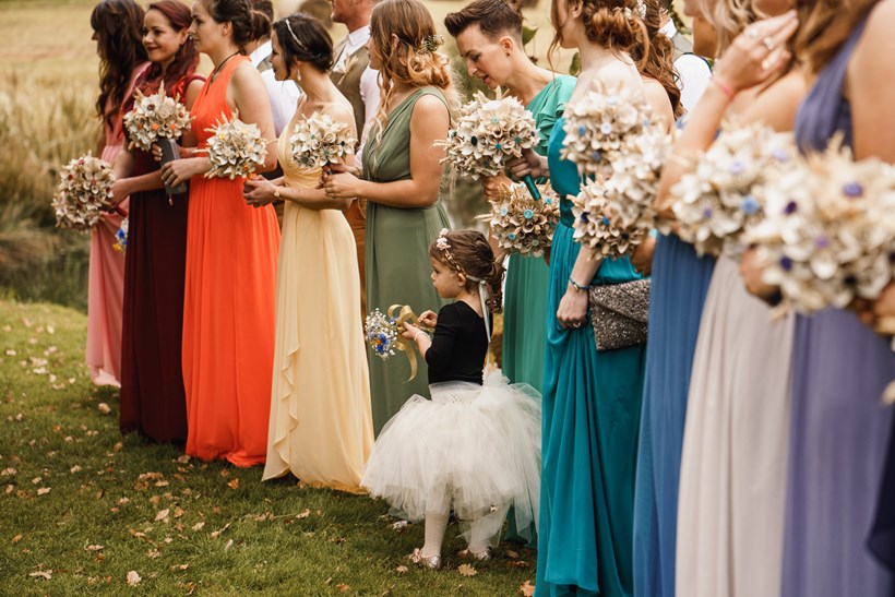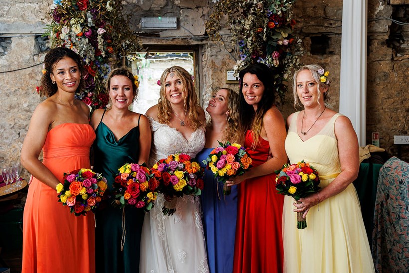 Bright pinks, oranges and yellows are all gloriously colourful choices for your bridesmaids and suit all complexions. Have everyone in the same colour. Or opt for a rainbow palette of bright colours.